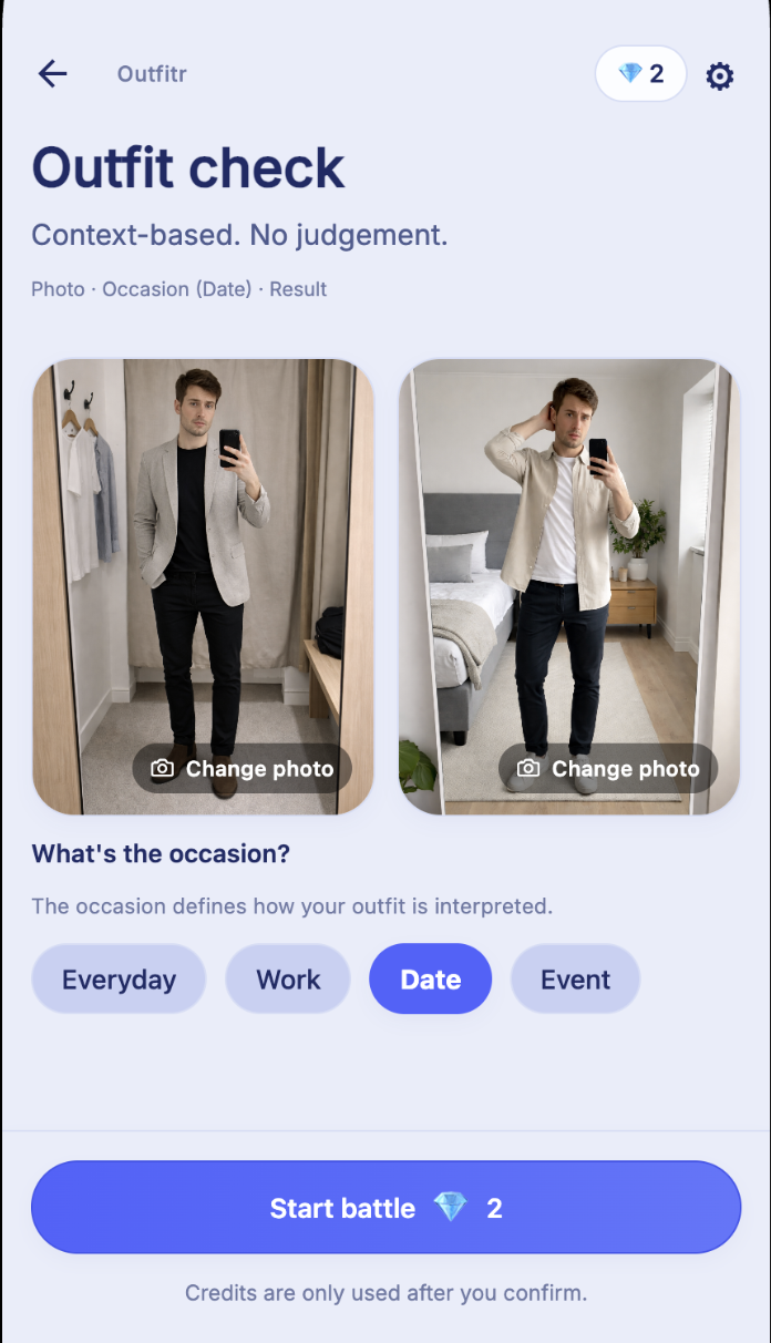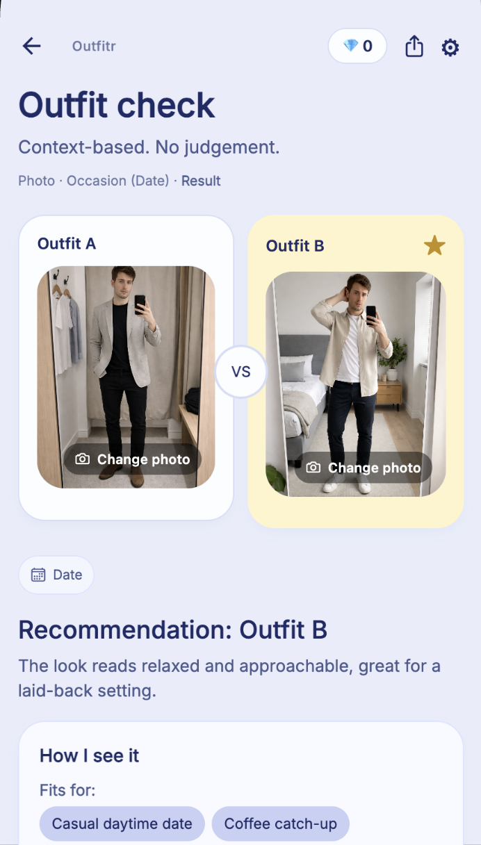 Upload two photos, pick the occasion and get a clear decision on which outfit fits the situation better.