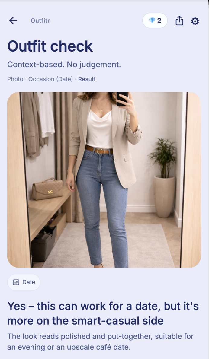 Upload a photo, optionally choose the occasion, then get a clear decision note—no scoring, no judgment.